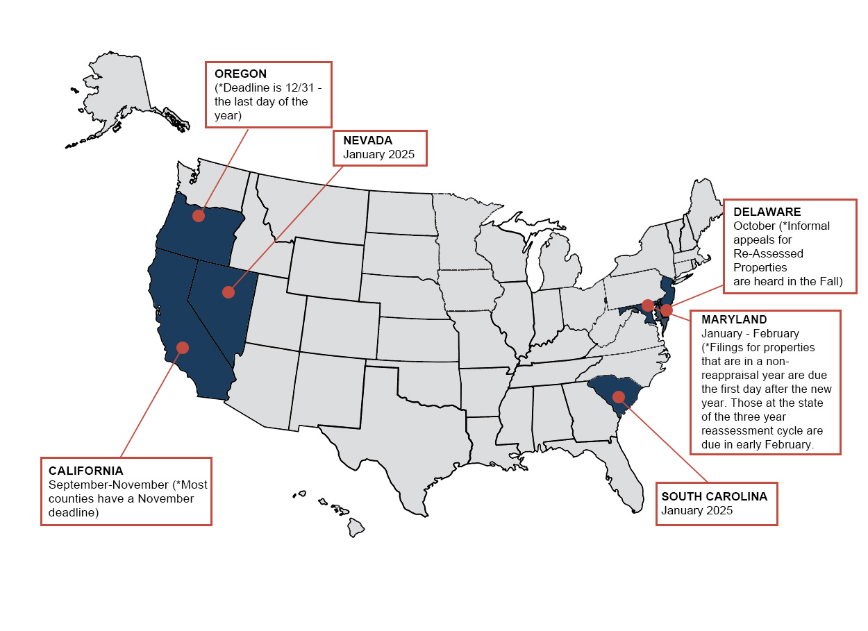 Taxpayers seeking to contest real property tax values established by assessing jurisdictions across the country often have a short window of opportunity to contest their new valuation. This time frame varies by state and by local jurisdiction, and in many cases begins to run upon the mailing of a new value notice. Below is a map of states/jurisdictions with upcoming appeal deadlines: