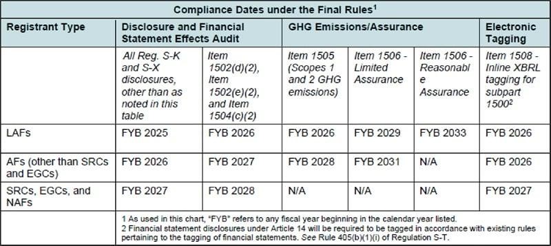 The new requirements are subject to various phased-in compliance dates. The new narrative and quantitative climate-related disclosures must be electronically tagged in Inline XBRL.